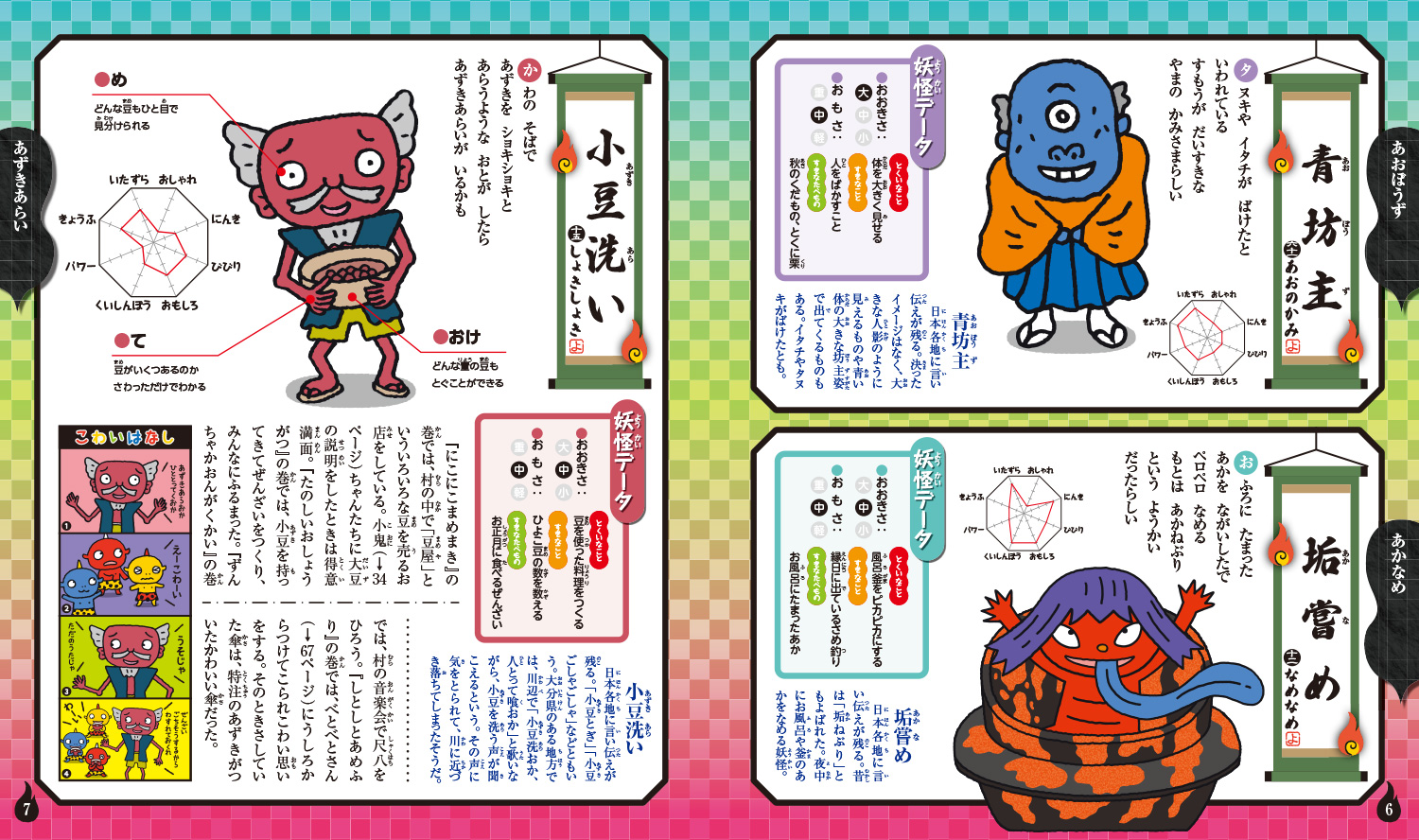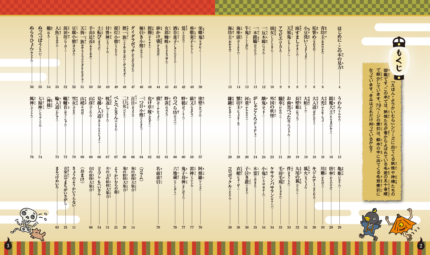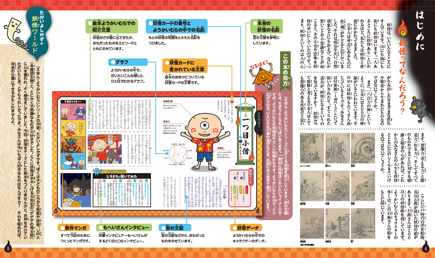 25巻目を刊行し、いったん完結を迎えた「えほん・ようかいむら」シリーズ(全25巻)。その絵本の中に登場した妖怪100体を解説した図鑑。妖怪を50音順に掲載し、絵本のエピソードやよもやま話だけでなく、本来の妖怪の伝承、別名、姿、特性についても紹介。コラムやゲームなども掲載し、巻末には絵本の中の名前の索引付。