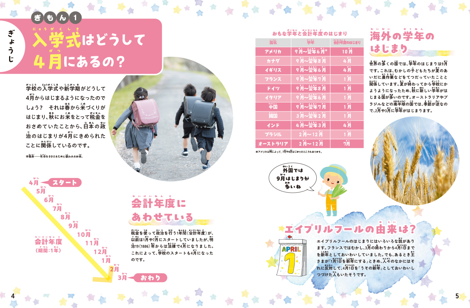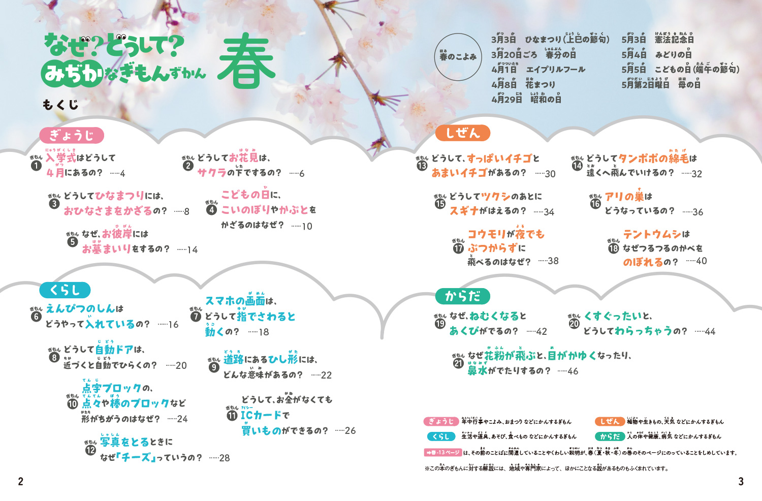 入学式はどうして4月にあるの? こどもの日に、こいのぼりをかざるのはなぜ? えんぴつのしんはどうやって入れるの? なぜ花粉がとぶと、目がかゆくなったり、鼻水がでたりするの? など、子どもたちが季節の移りかわりや生活の中で出会うさまざまな「春のぎもん」に絵と写真で答える図鑑。生活科の補助教材としても最適です。
