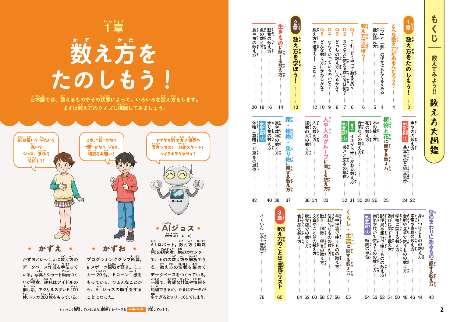 子どもたちの「これはどう数えるのだろう?」「どんな数え方があるの?」にこたえる助数詞の図鑑。数えるものをジャンルごとに7つに分け、数え方を紹介し、数え方の原則や特殊な数え方を解説します。クイズやゲームをたのしみながら助数詞を身近に感じ、日常生活の中で迷わず正しく使えるようになります。巻末には助数詞一覧を掲載。